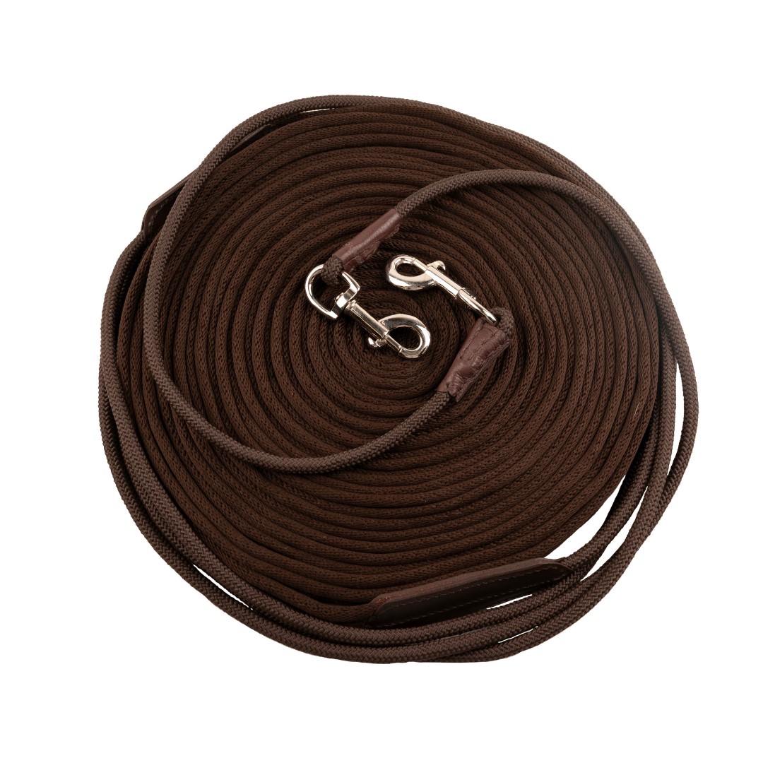Dubbele longeerlijn bestaat uit twee ronde koorden, te bevestigen aan de bitringen door middel van twee zilverkleurige musketons. Daarna gaat dit over in een plat, soft webbing lijn.