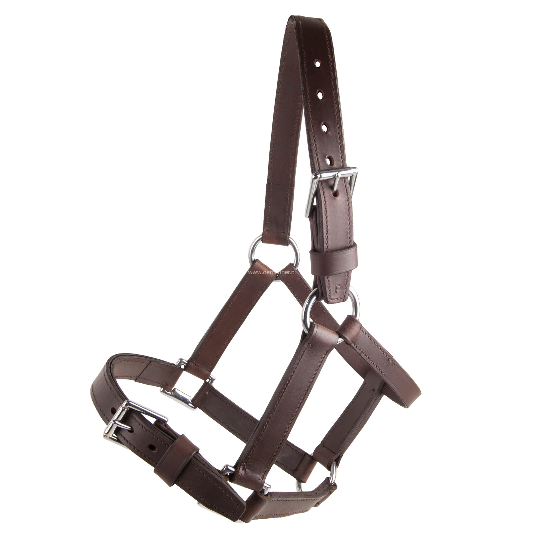 Dieses geschmeidige, aber robuste Lederhalfter verfügt über einen Schnallenverschluss an der Nase, sodass es nach dem Anlegen des Zaumzeugs leicht entfernt werden kann.