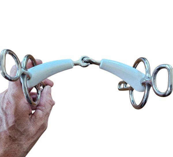 Mundstück aus weißem Kunststoff, einfach gebrochen mit Verriegelung, sodass sich das Mundstück niemals weiter als nach vorne gebogen verbiegen kann